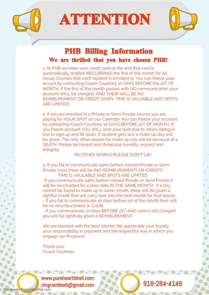 (All on time cancellations will be dealt with on a credited basis/ if lesson can’t be made up in that same month) –This is for Semi private and Private classes only-